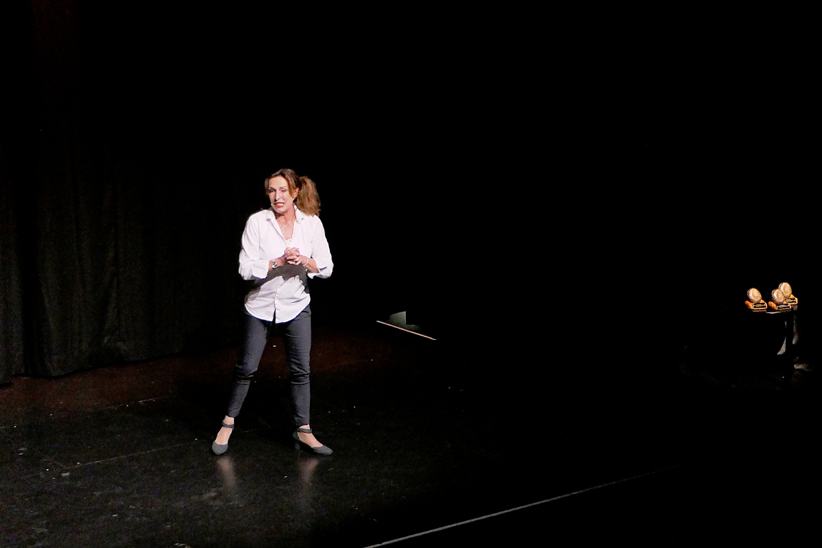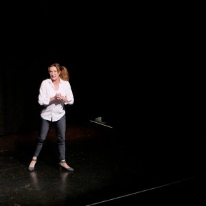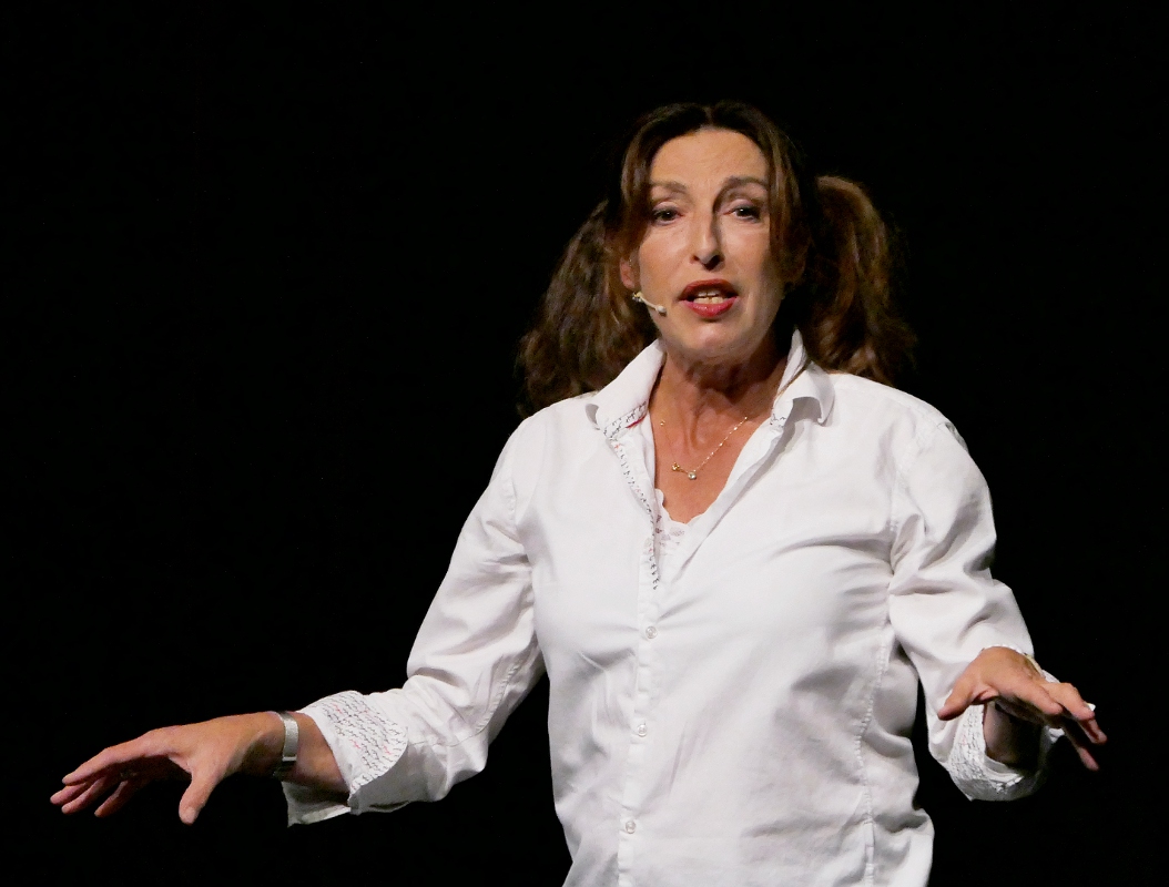 Über ihren Alltag im Büro ließ sich Andrea Volk aus. Die Geschichten der Wahl-Kölnerin mit „Migrationshintergrund Duisburg“ stießen auf einen hohen Wiedererkennungswert beim Publikum – so gibt es vielerorts in Büros die sogenannte „Drachen-Doris“ und die Kaffeeküche, in der man mehr Informationen bekommt als in jedem Meeting.