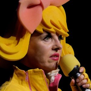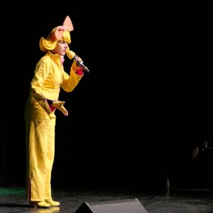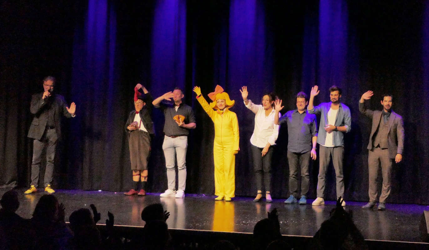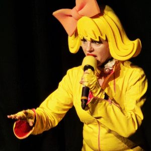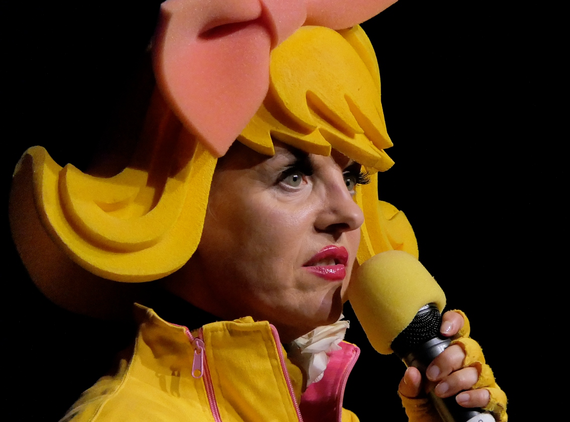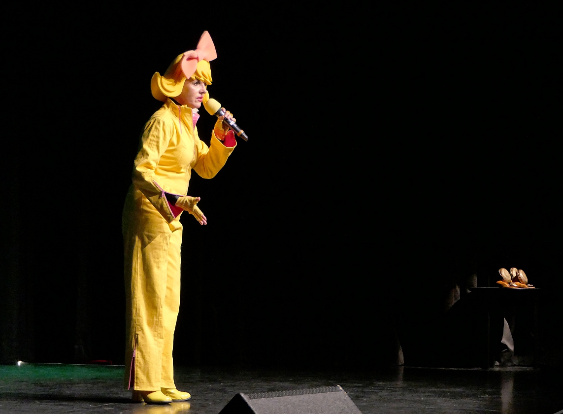 Bartuschka ist ein Gesamtkunstwerk aus Berlin, in der dortigen Kleinkunstszene eine feste Größe, aber in gängige Kleinkunst-Schubladen lässt sich die ganz in gelb gewandete Künstlerin nicht einordnen. Und so dauerte es etwas, bis sich auch das Herborner Publikum auf sie einlassen konnte und am Ende erstaunt war über die zielsichere Schnellzeichnung eines Kandidaten.