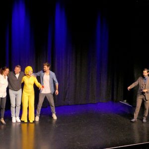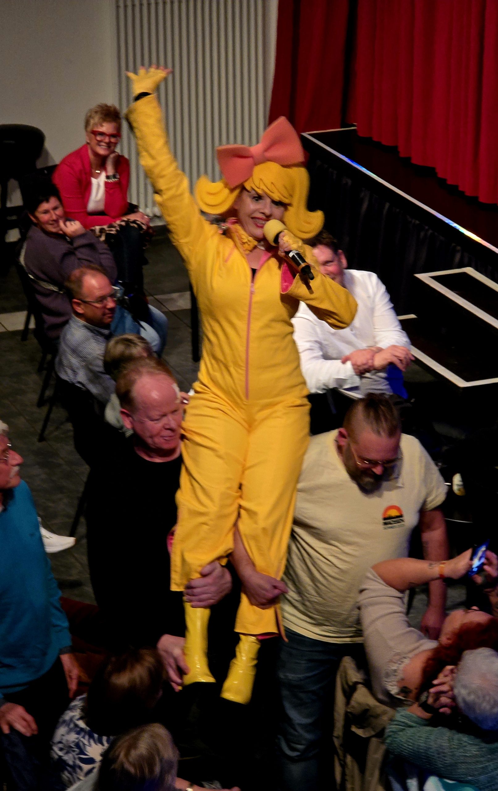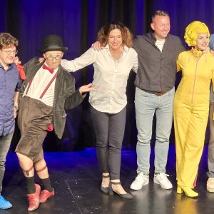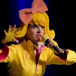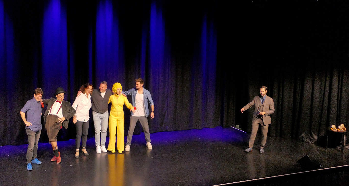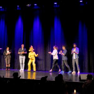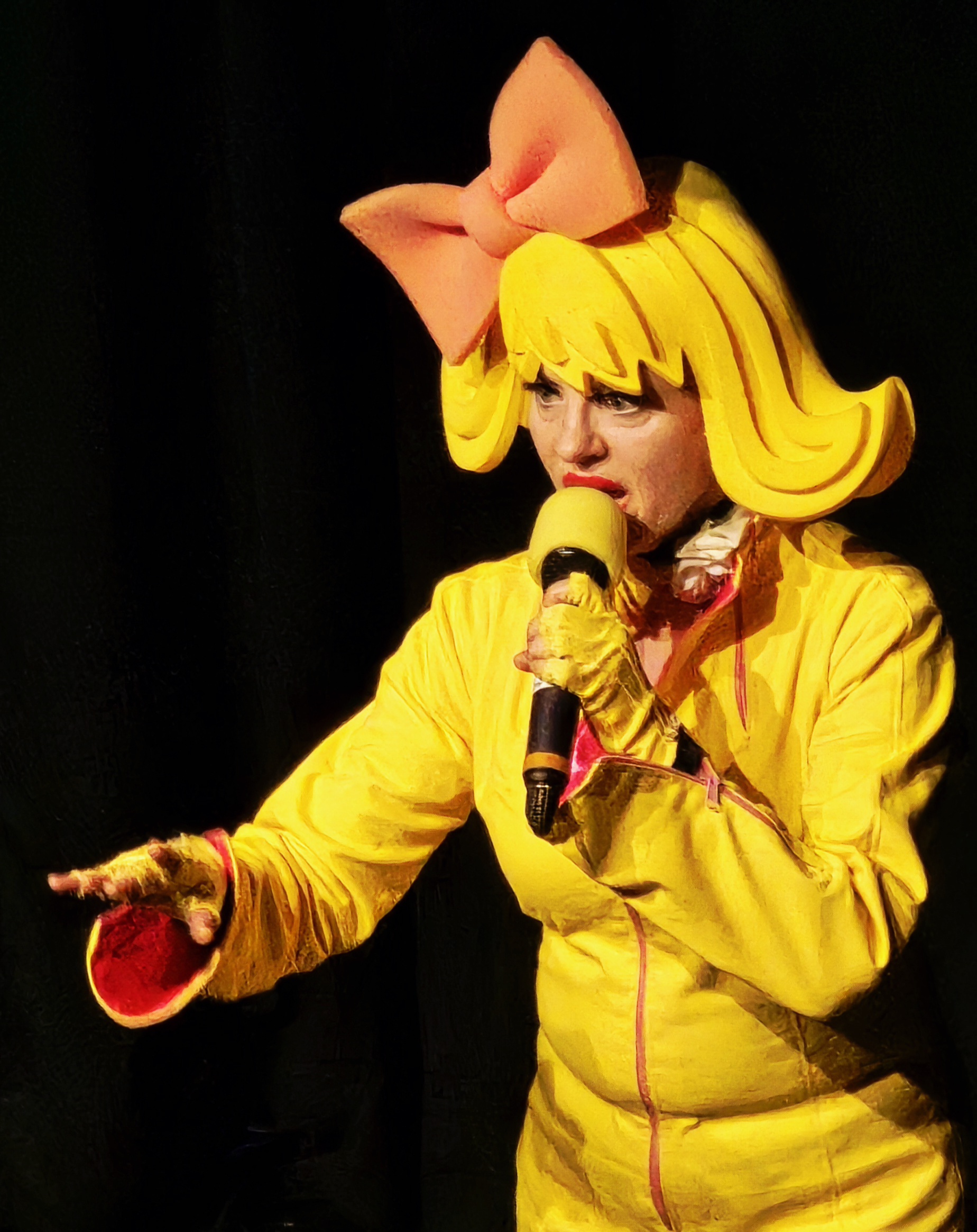 Bartuschka ist ein Gesamtkunstwerk aus Berlin, in der dortigen Kleinkunstszene eine feste Größe, aber in gängige Kleinkunst-Schubladen lässt sich die ganz in gelb gewandete Künstlerin nicht einordnen. Und so dauerte es etwas, bis sich auch das Herborner Publikum auf sie einlassen konnte und am Ende erstaunt war über die zielsichere Schnellzeichnung eines Kandidaten.
