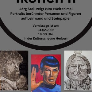 Zum zweiten Mal zeigt der Wetzlarer Künstler Jörg Stoll seine Werke in der KuSch. „Ikonen II“ hat er seine Ausstellung betitelt, die bekannte Persönlichkeiten der (Zeit-)Geschichte zeigt. Die Kunstwerke sind auf Leinwand und Steinpapier entstanden. Eröffnet wird die Ausstellung, die in den kommenden Monaten zu den Öffnungszeiten im Foyer der KuSch zu sehen ist, am Dienstag, 24. Februar, um 19 Uhr.