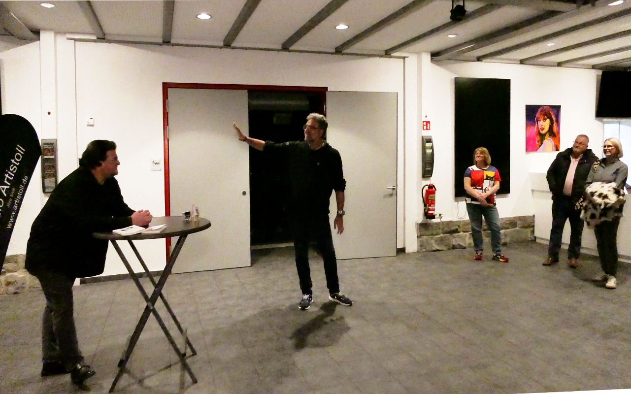 Bei der Vernissage hob KuSch-Vorsitzender Jörg Michael Simmer die Möglichkeit solcher Ausstellungen im 2019 neu gestalteten Foyer hervor und ging auf die gemeinsame Bühnengeschichte ein. Schließlich stand Jörg Stoll vor über 35 Jahren auch bei den Heimatspielen des Vereins auf der Freilichtbühne.