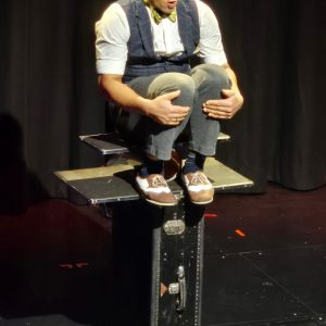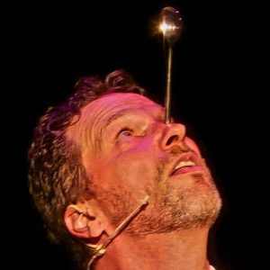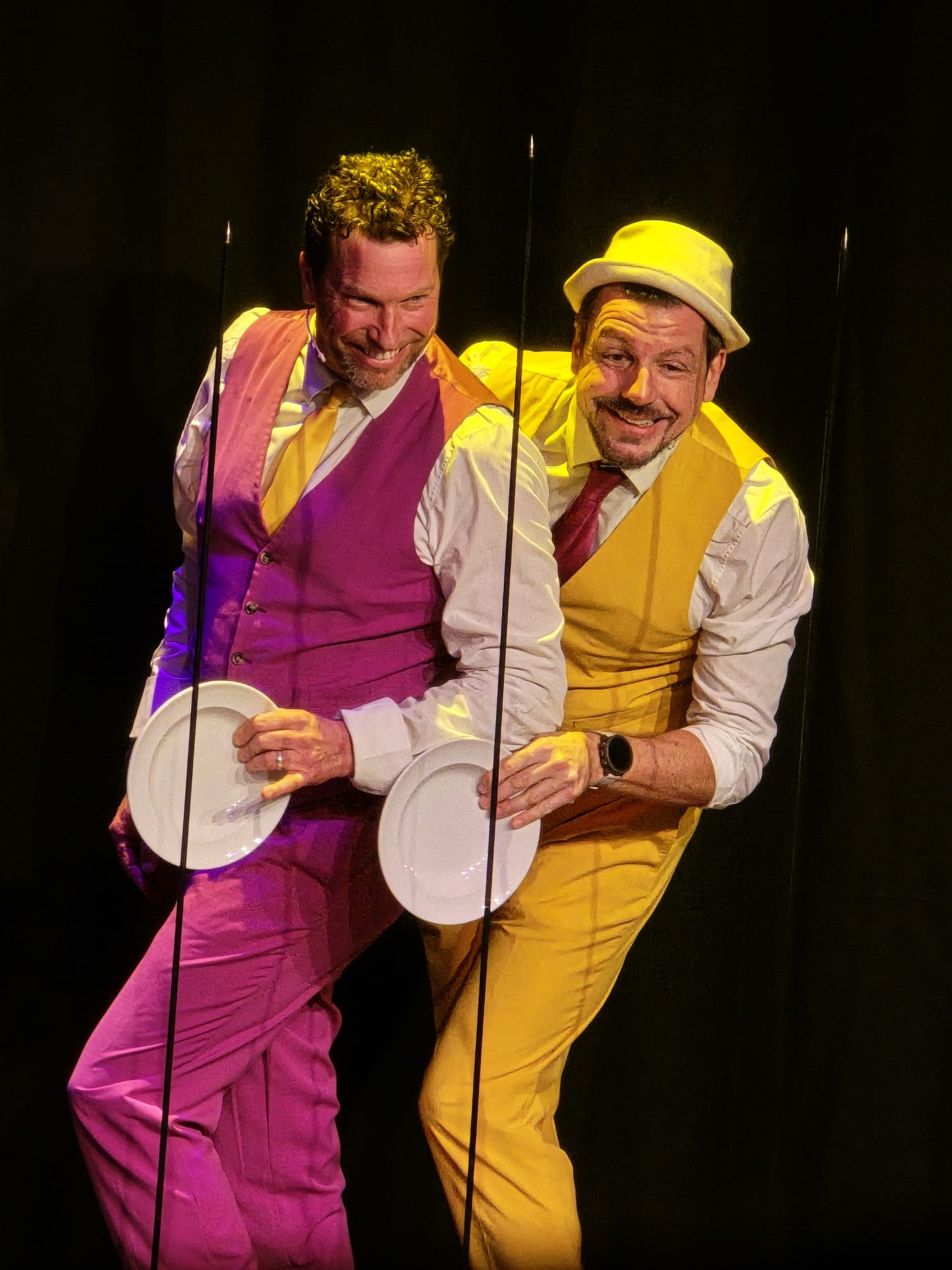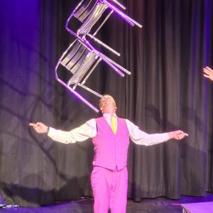 In Herborn spielten die beiden Vollblut-Comedians, die als Duo „klirr deluxe“ firmieren, Ausschnitte aus ihrem reichhaltigen Repertoire. Ihr Werkzeug sind Teller, Stühle, Flaschen und alles, was sonst definitiv nicht in die Luft gehört. Drehend, balancierend, feuerschluckend – beiden Tausendsassas sind einfach charismatische Publikumsmagneten. Und das nicht nur wegen ihres schillernden Bühnenoutfits in purpurnen und gelben Anzügen. Während es bei diesen beiden rasant, interaktiv und bisweilen brüllend komisch zuging, war Monsieur Momo eher das programmatische Gegenteil.