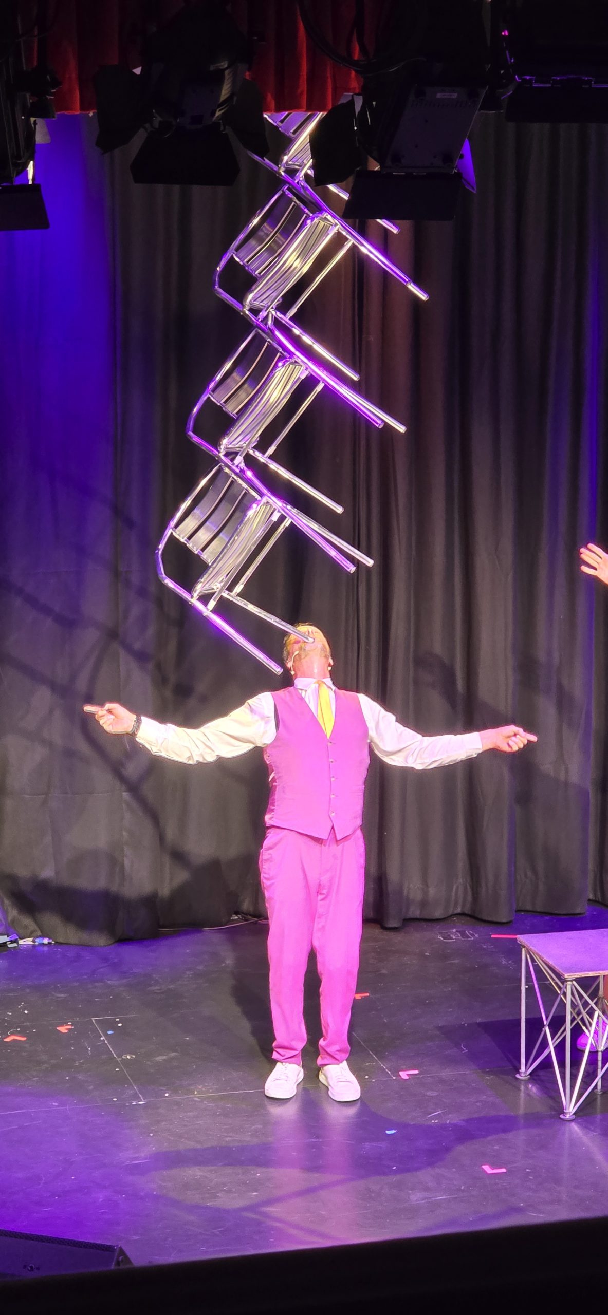 Der Schlumpeweck-Gewinner von 2025 ist ein Meister der leisen Töne. Der staatlich geprüfte Clown mit Roncalli-Vergangenheit hat meist nur ein Wort für seinen Auftritt parat – ein augenzwinkerndes „Magic“. Wenn er auf einem Besen reitet, plötzlich drei Hände hat oder über Flaschen läuft: Die Posie des Augenblicks, gepaart mit tatsächlichem Können amüsiert die Zuschauer und machte ihn gerade erst zum „Best Clown 2026“ beim „World Circus Cup“.