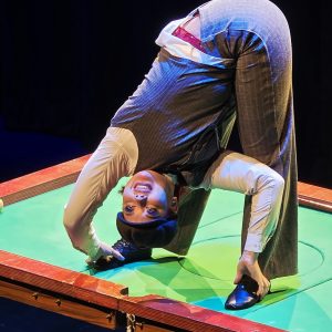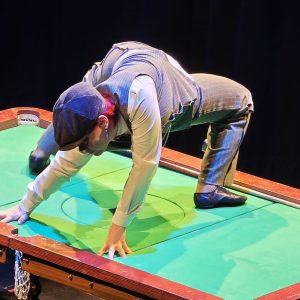 „Monsieur Chapeau“ nennt sich ein wahrer Meister des Gleichgewichtssinns. Er balanciert auf bis zu fünf Rollen oder wahlweise einer Bowlingkugel und fasziniert durch sein enormes Körpergefühl. Dabei hat er immer den Schalk im Nacken.