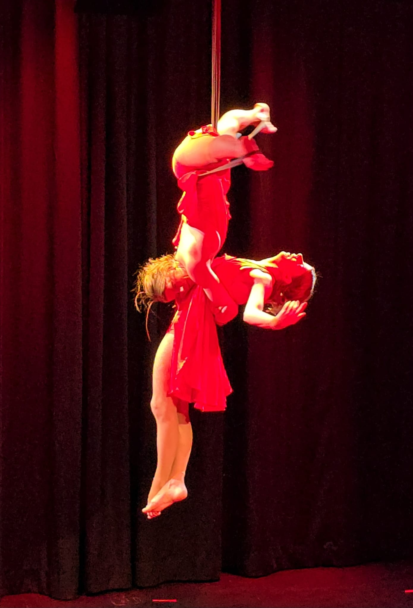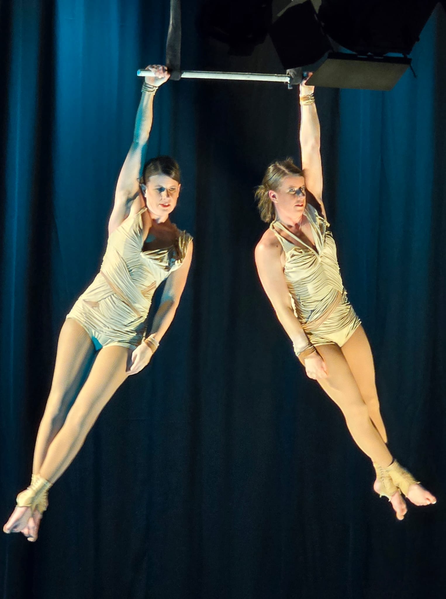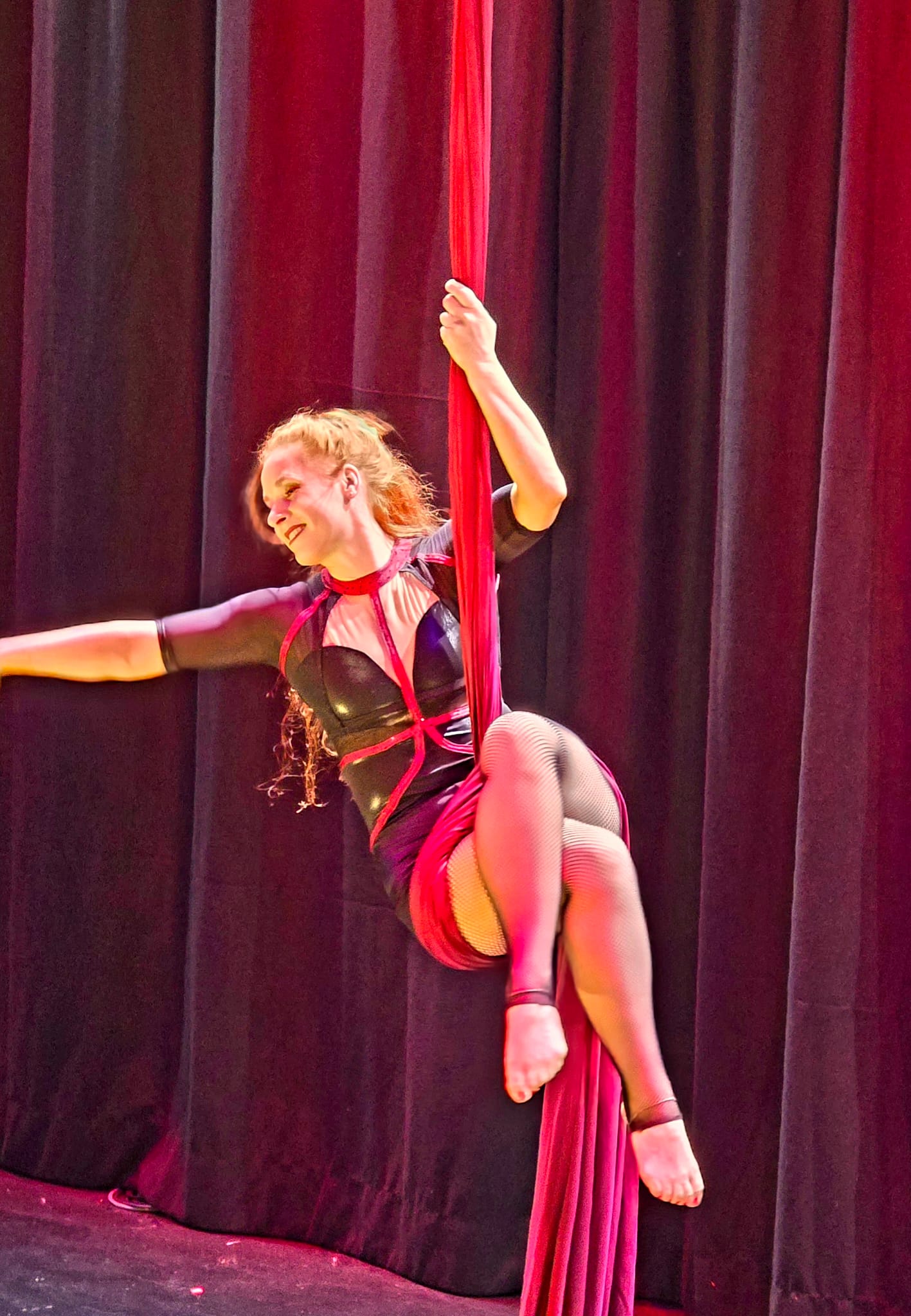 In der Höhe, rund sechs Meter über der Bühne, spielten sich drei weitere Acts ab. Anna Ehrenreich knotet ihre Tücher, um eindrucksvolle Bilder in der Luft entstehen zu lassen. Kraft und Eleganz vereinen sich dabei und auf grazile Posen folgen atemberaubende Momente, in denen sie sich metertief fallen lässt, wobei sie von den Seidentüchern wieder aufgefangen wird.