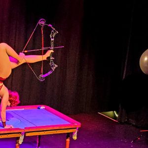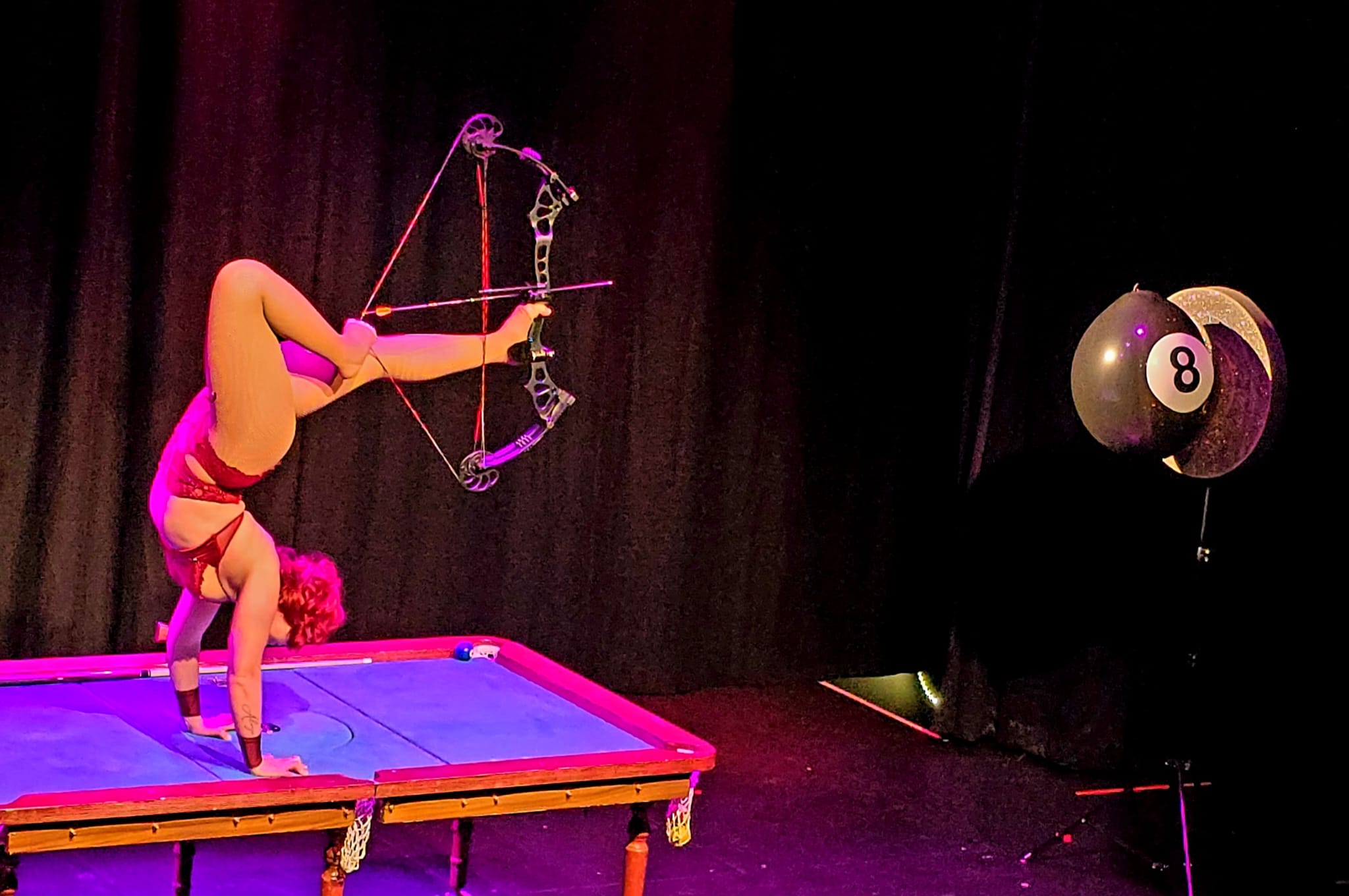 Sheyen Caroli stammt aus einer italienischen Zirkusfamilie und hat eine Kontorsionsnummer entwickelt, die weit mehr ist als das „körperliche Verbiegen“. Das Spiel mit den Geschlechtern und der fulminante Schlusspunkt, wenn sie mit den Füßen eine Armbrust bedient und dabei ins Schwarze, bzw. einen Ballon trifft, zieht die Zuschauer in ihren Bann.